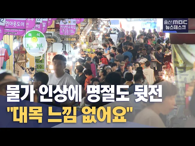[앵커]추석 명절이 일주일 앞으로 다가왔지만, 전통시장에는 명절 대목 분위기는 온데 간데 없는 상황입니다.명절 대표 식재료 가격이 크게 인상되지는 않았지만, 체감 물가는 그 어느때보다 높다보니 시민들의 지갑도 좀처럼 열리지 않고 있습니다.정인곤 기자입니다.[리포트]울산 남구 신정시장.시장 골목골목마다 먹거리...