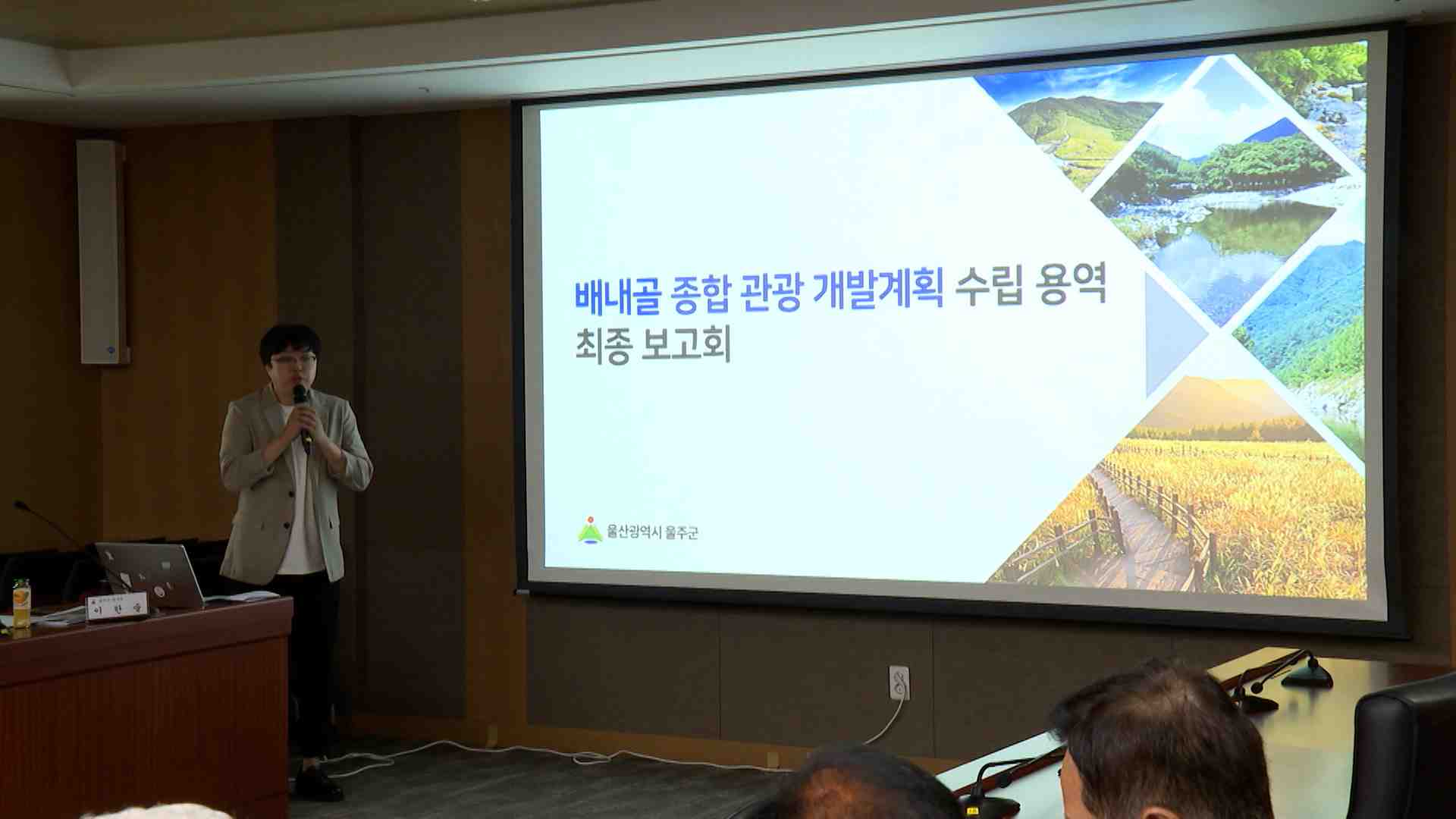 울주군은 오늘(6/8) 배내골 종합관광개발 계획 수립 용역 최종보고회를 열고 체류형,계절별 관광개발 계획을 수립하기로 했습니다. 용역을 맡은 '함께인' 사회적협동조합은 지역·관광의 상생과 성장을 비전으로 배내골에 산악 및 라이딩 센터 구축과 카페, 마을공방, 회의실 등을 갖춘 영남알프스 종합 관광 센터를 구축하...