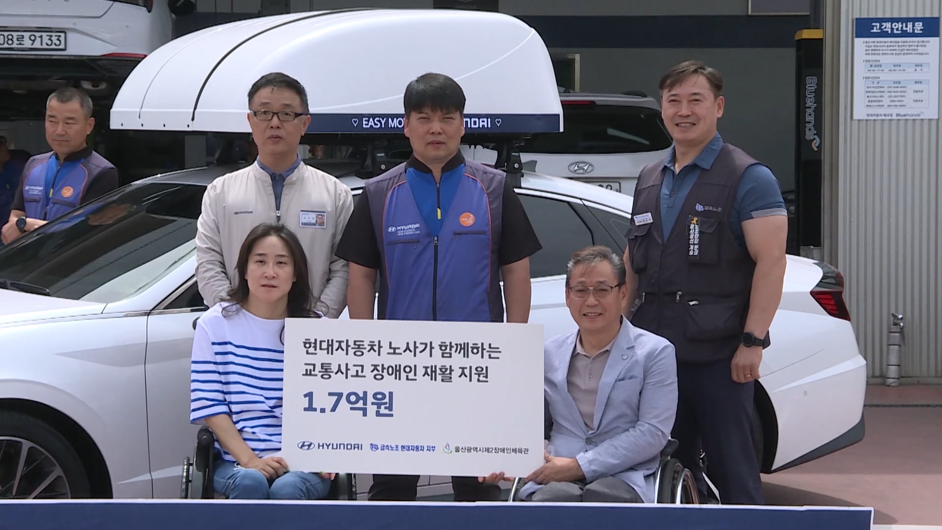 현대자동차 노사는 오늘(5/24) 북구 블루핸즈 매곡점에서 올해 교통사고 장애인 재활지원사업 행사를 열고 울산 제2장애인 체육관에 사회공헌기금 1억 7천만 원을 기탁했습니다. 해당 기금은 장애인 차량 120대 무상점검과 노후차량 타이어 교체,장애인 재활격려금 등 10개 사업에 사용될 예정입니다.