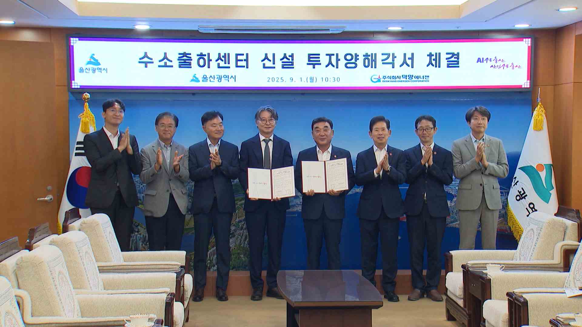 울산시와 덕양에너젠이 오늘(9/1) 미포국가산업단지에 수소 생산공장을 신설하는 업무 협약을 체결했습니다. 덕양에너젠은 내년 10월까지 220억 원을 투입해 남구 황성동에 수소 버스 10대를 동시에 충전할 수 있는 규모의 수소 생산 설비와 출하센터를 건립하기로 했습니다. 울산시는 최근 수소 설비 투자가 이어지면서 지...