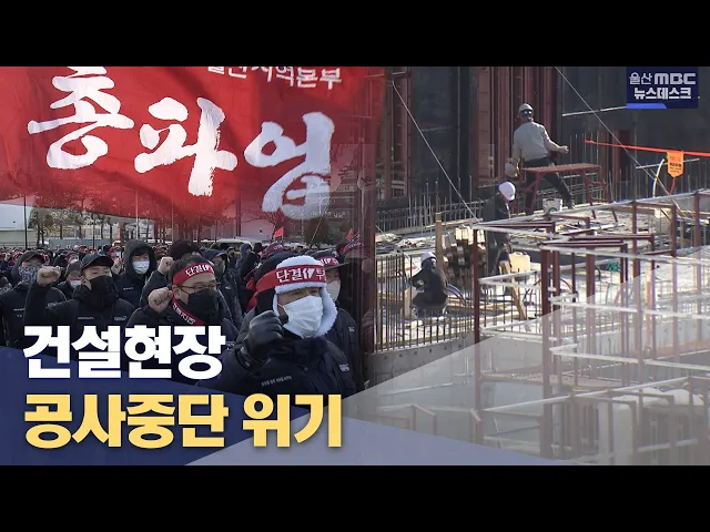 [앵커] 화물연대 총파업에 건설 노동자들까지 가세하면서 물류와 건설자재 수급에 빨간불이 켜졌습니다. 철근과 콘크리트로 건축물의 뼈대를 만드는 울산지역 대규모 건설현장에서도 파업이 길어질수록 공사가 지연될 전망입니다. 최지호 기자입니다. [리포트]"투쟁!민주노총 산하 16개 노조가 화물연대 파업에 힘을 보태겠...