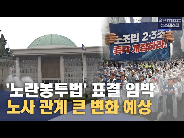[앵커]이른바 '노란봉투법'의 국회 표결이 임박하자 경제계와 노동계가 각각 여론전을 펼치며 첨예하게 대립하고 있습니다. 더불어민주당이 21일 본회의 처리 방침을 밝히고 있는 가운데, 수직 원·하청 관계로 유지되는 울산의 자동차와 조선 업종의 노사 관계에 큰 변화가 예상됩니다. 홍상순 기잡니다. [리포트]'노란봉투...