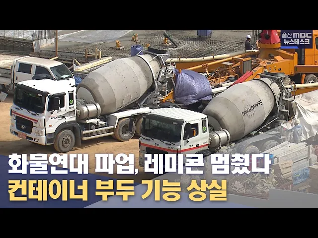 [앵커] 화물연대 파업으로 울산에서도 레미콘 가동을 중단하는 공장들이 속출하고 있습니다. 울산항 컨테이너 부두는 처리 물량이 평소보다 25분의 1로 줄면서 부두 기능을 사실상 상실했습니다. 이용주 기자입니다. [리포트] 울주군 삼동면의 한 레미콘 업체. 울산지역 공사현장 20곳에 투입돼야 할 레미콘 차량들이 공장 ...