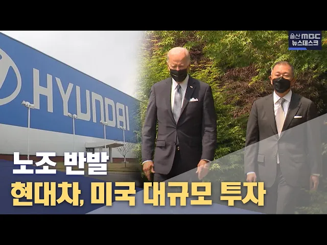 [앵커] 현대자동차가 13조 원의 미국 투자를 약속하면서 파장이 커지고 있습니다. 현대차는 미국 내수 시장을 잡아야 글로벌 시장을 선도할 수 있다는 입장인 반면, 노조는 일방적인 해외 공장 설립 발표는 단협 위반이라며 반발하고 있습니다. 이상욱 기자가 보도합니다. [리포트] 현대차가 미국 바이든 대통령 방한에 맞...