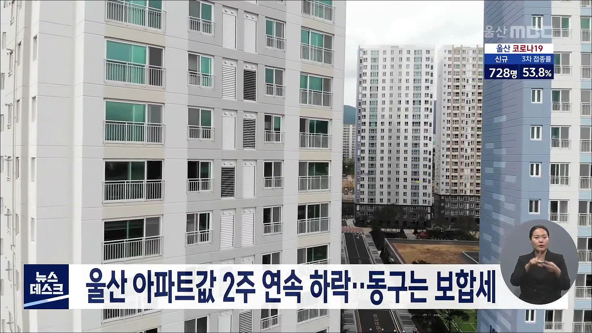 울산지역 아파트값이 2주 연속 하락세를 이어가고 있습니다. 한국부동산원 조사를 보면 2월 첫째 주 울산의 아파트값은 전주 대비 0.02% 떨어져 지난주 -0.04%에 이어 하락세를 지속했습니다. 구·군별로는 북구가 0.04% 줄며 3주 연속 하락세를 이어갔고, 중구와 울주군은 -0.03%, 동구는 지난주 하락에서 보합으로 돌아섰...