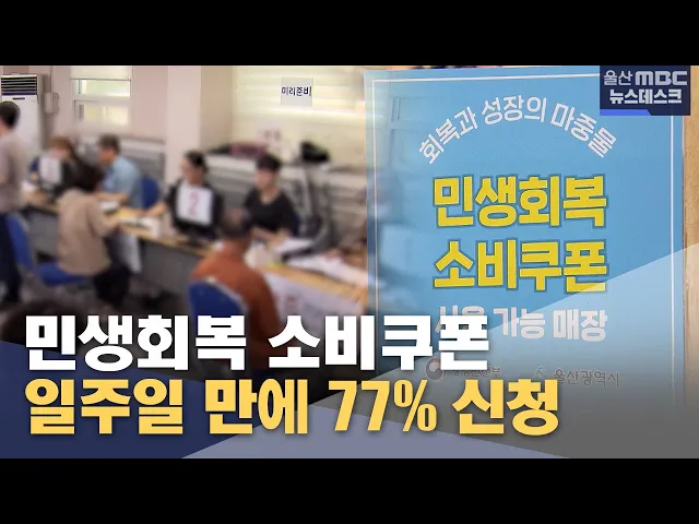 [앵커]민생회복 소비쿠폰 접수를 받기 시작한 지 1주일 만에 울산에서는 대상자의 77%가 신청을 마쳤습니다. 요일에 관계없이 소비쿠폰을 수령할 수 있는 첫날인 오늘(어제), 주민센터에는 뒤늦게 신청에 나선 주민들로 북적였습니다. 이용주 기자. [리포트]"145번, 145번 나오세요."행정복지센터 강당이 아침 일찍부터 주...