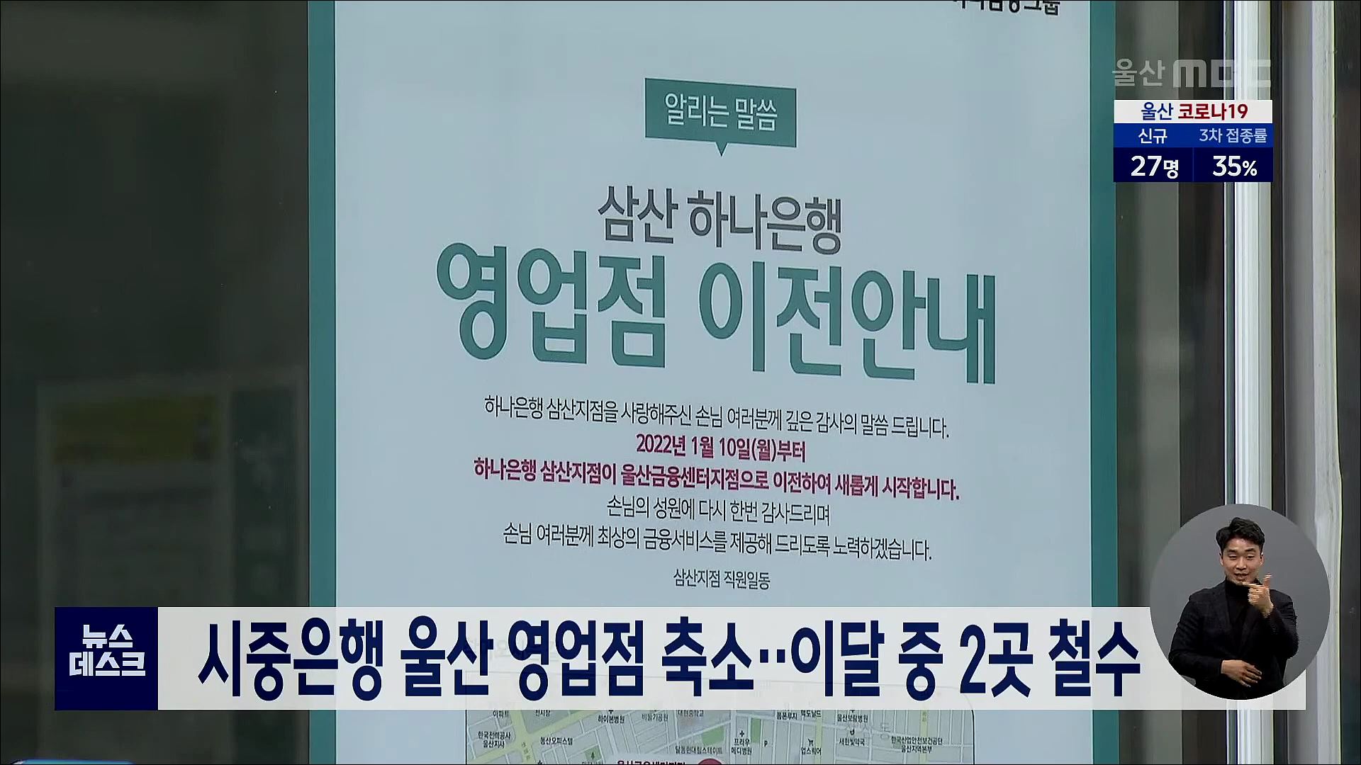 울산지역 시중은행 영업점이 잇따라 문을 닫고 통폐합됩니다. 하나은행은 오는 10일 남구 삼산점을 인근 울산금융센터에 이전 통합할 예정입니다. 신한은행은 오는 17일 중구 성남동 지점을 약사동 지점에 통폐합하기로 했습니다. 지난해 울산에서는 경남은행 4곳을 포함해 6개 점포가 문을 닫았습니다.