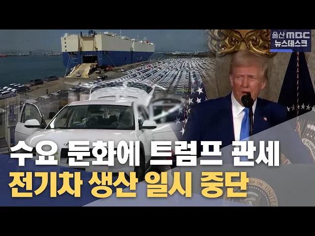[앵커]이렇게 지역에서는 기업 투자를 독려하고 지원하고 있지만 대외 악재가 심상치 않습니다. 수요 둔화로 전기차 생산이 일시 중단되는데 트럼프 대통령의 폭탄 관세도 현실화됐습니다. 위기감이 최고조에 이르는 가운데 더 발빠른 대응과 지원이 필요하다는 지적입니다. 이용주 기자. [리포트]전기차 아이오닉5와 코나E...