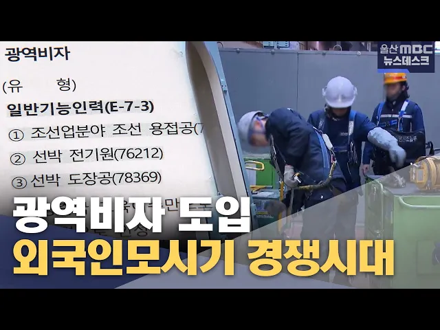 [ 앵 커 ]오는 3월부터 광역비자가 처음으로 도입됩니다. 광역비자는 정부가 독점했던 비자 발급 권한 일부를, 지방자치단체에 넘겨주는 건데요. 인구 감소와 산업계 인력난을 해결할 묘수로 떠오르면서 지방자치단체들이 경쟁적으로 나서고 있습니다. 홍상순 기자입니다. [ 리포트 ]울산시가 '울산형 광역비자' 준비에 분...