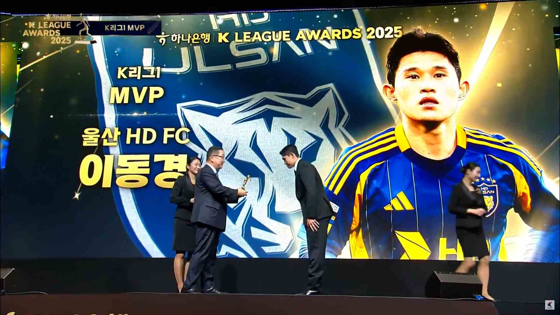 울산 HD 이동경이 오늘(12/1) 열린 K리그 시상식에서 2025 K리그1 MVP로 선정됐습니다.이동경은 올 시즌 군 복무 기간 김천 상무 소속으로 13골 11도움을 기록했으며, 35라운드부터 울산으로 복귀해 2경기에서 1도움을 추가했습니다.한편 K리그1 베스트 11에는 MVP 이동경 외에 울산 소속 선수는 한 명도 선정되지 못했습니...