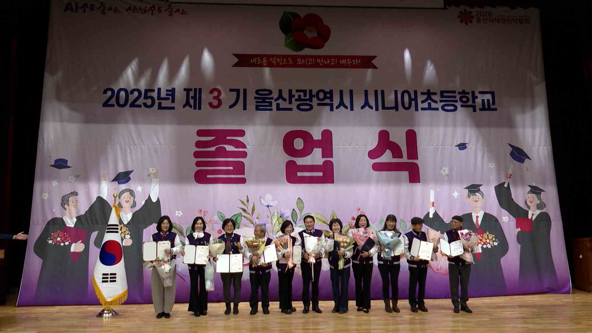 울산 시니어초등학교 제3기 졸업식이 오늘(12/2) 울산가족문화센터 대강당에서 열렸습니다.3시 졸업생은 56세에서 74세 울산시민 176명으로 시니어모델과 문화 탐방, 스마트기기 활용 등 다양한 과정을 수료했습니다.시니어초등학교는 인구유출과 지방소멸에 대응하기 위해 베이비붐 세대와 은퇴자, 어르신들에게 다양한 맞...