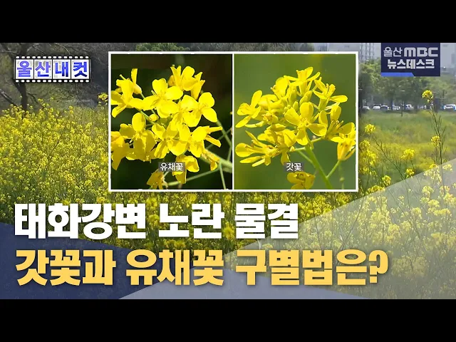 [앵커]울산 태화강변에 유채꽃뿐만 아니라 갓꽃 군락지가 형성돼 있다는 걸 아시나요? 갓꽃을 보고도 생김새가 비슷해서 유채꽃이라고 착각하곤 하지만, 자세히 보면 차이가 있습니다.오늘의 [울산내컷]에서는 유채와 갓의 구별법을 소개합니다.성예진 리포터입니다.[리포트]따스한 봄 햇살 아래,태화강변을 따라 노란 색...