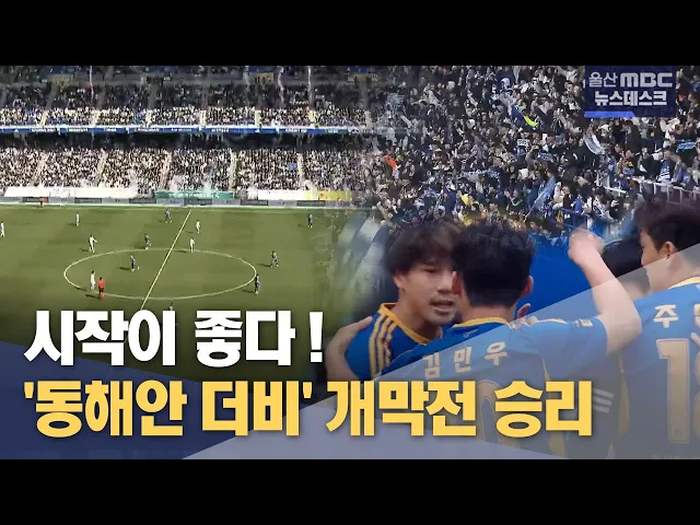 [ 앵 커 ]울산과 포항의 올시즌 K리그 개막전이 오늘(3/1) 울산 문수축구경기장에서 펼쳐졌습니다. 2만 8천명이 넘는 구름 관중이 모인 가운데 울산HD FC는 개막전을 승리하며 기분좋은 출발을 신고했습니다.정인곤 기자[리포트]울산과 포항, 전통의 라이벌 간의 동해안 더비로 k리그 개막전이 펼쳐진 울산 문수축구경기...
