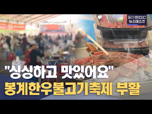 [앵커]울산 대표 먹거리 축제인 봉계한우불고기 축제가 6년 만에 부활했습니다.지난해 국내 최고 한우를 배출한 한우 명가의 축제 소식에 방문객들의 발길이 이어지고 있습니다.정인곤 기자입니다.[리포트]거대한 천막 사이로 고소한 고기 냄새가 퍼집니다.안에서는 뜨거운 참숯불에 한우 생고기를 구워먹는 사람들로 가득...