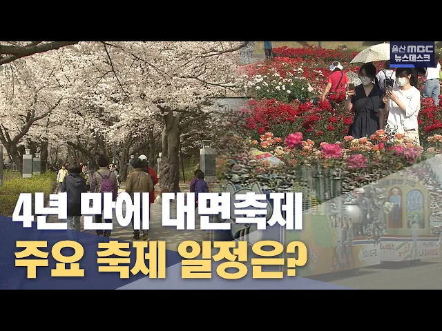 [앵커]울산을 들썩였던 지역 대표 축제들이 2019년 이후 4년 만에 대면 축제로 돌아옵니다. 작천정 벚꽃축제부터 태화강 마두희 축제까지, 이용주 기자가 올 상반기 주요 축제 일정을 알아봤습니다. [리포트]4년 만에 돌아온 대면축제의 첫번째 무대는 울산지역 벚꽃 명소가 될 것으로 보입니다. 울주군은 이달 말 작천정 ...
