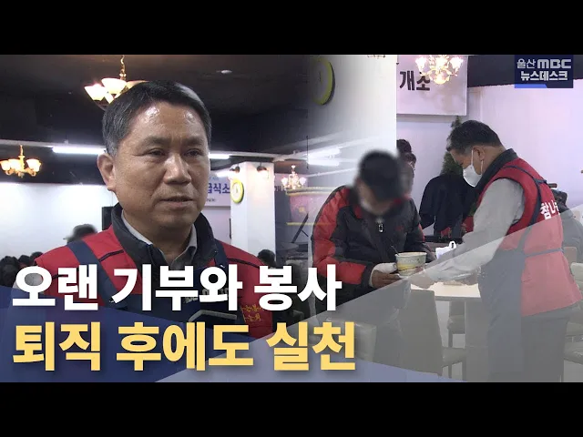 [앵커] 울산MBC는 연말을 맞아 이웃 사랑을 실천하는 시민들을 소개하는 연속 기획을 마련했습니다. 오늘은 긴 시간 기부와 봉사를 해오며 퇴직 후에도 나눔 문화를 이어오고 있는 기부자를 소개합니다. 윤수미 리포터가 전해드립니다. [리포트] 울산의 한 무료 급식소. 자원봉사자들이 재료를 정성껏 손질해 음식을 만들고...