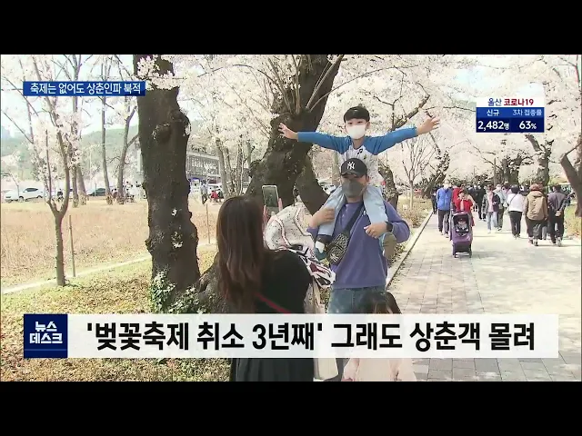 앵커 │울산지역에도 벌써 벚꽃이 가득 피었지만 올해도 코로나19 여파로 축제는 열리지 않았습니다. 그래도 방문 자체를 금지한 건 아니어서 울산지역 벚꽃 명소마다 상춘객들의 발길로 온종일 북적였습니다. 이용주 기자. 리포트 │ 흐드러진 연분홍빛 물결 속 올망졸망 텐트들이 모여 있습니다. 아이들이 공놀이에 열중하...