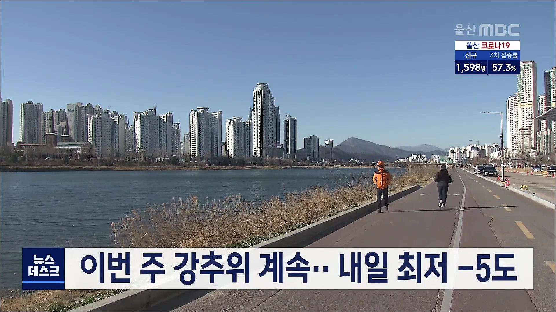 오늘(2/20) 울산지방은 아침 최저기온이 영하 4.7도까지 떨어짔고 북구 매곡에서는 영하 8.9도를 기록하는 등 강추위를 보였습니다. 북쪽에서 내려온 찬 공기의 영향으로 내일도 아침 최저 영하 5도로 이번 주 초에는 당분간 추위가 계속될 것으로 예상됩니다. 한편 울산지역의 건조주의보가 오늘 오전 10시를 기해 경보로 ...