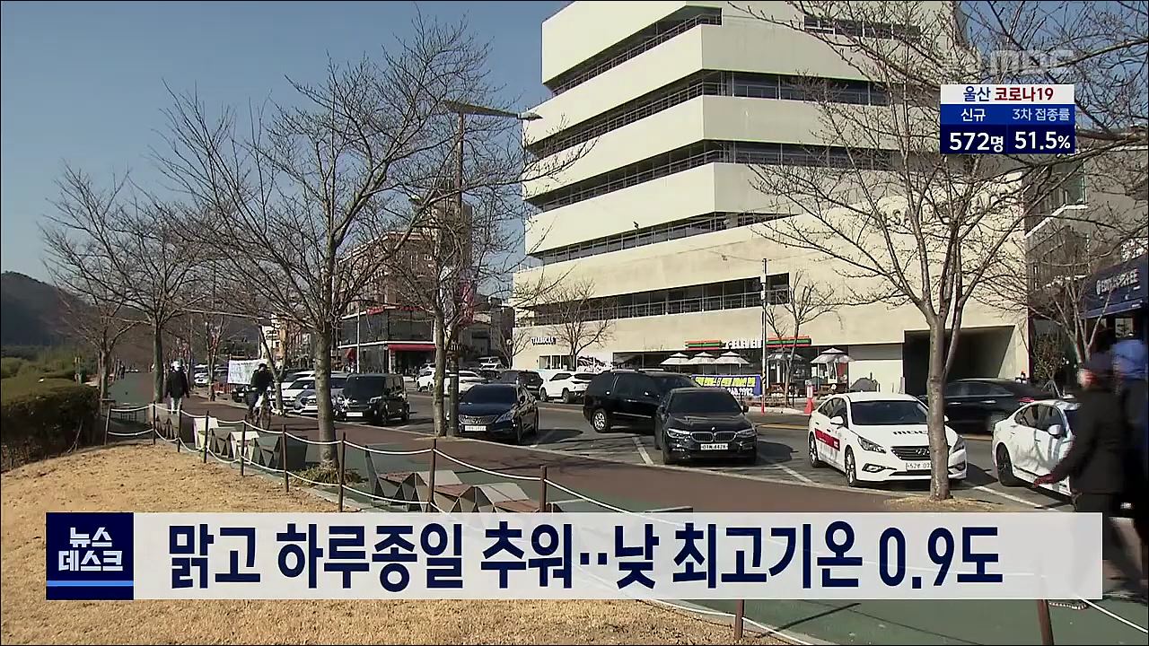 울산지방은 오늘(2/5) 대체로 맑은 가운데 낮 최고 기온이 평년보다 8도 낮은 0.9도로 하루종일 추웠습니다. 내일은 기온이 아침 최저 영하 5도, 낮 최고 5도로 오늘보다는 조금 풀리겠습니다. 울산에는 현재 건조경보와 함께 먼 바다에 풍랑주의보가 내려져 있어 화재와 항해하는 선박의 주의가 필요합니다.