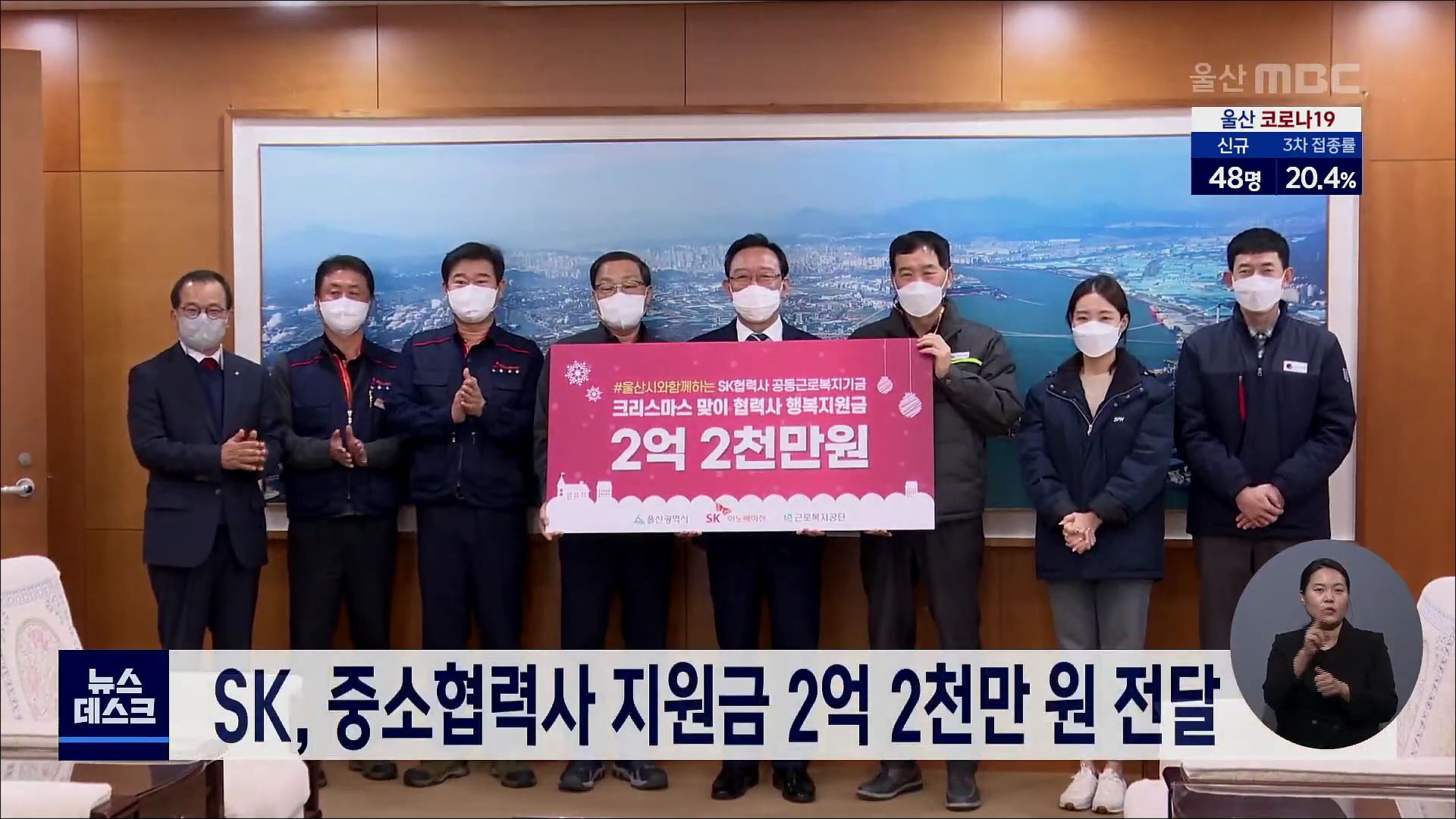 SK이노베이션 노사는 오늘(12/21) 시청을 찾아 중소협력사 지원금 2억2천만 원을 전달했습니다. 지원금은 SK이노베이션 노·사 공동 1% 상생기금을 모아 마련된 것입니다. 지원금은 25개 사내협력사 직원 2천200명에게 1인당 10만원씩 온누리상품권으로 지급될 예정입니다.