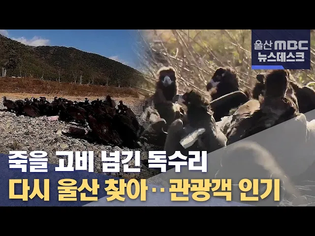◀ANC▶천연기념물이자 멸종위기종인 독수리가 멀리 몽골에서 울산으로 날아와겨울을 나고 있는데요. 이 중에는 올해 초 죽을 고비를 넘겼던독수리가 다시 찾아와 눈길을 끌고 있습니다.울산이 독수리 겨울나기 터로 유명세를 떨치면서 관광객들도 찾고 있습니다. 최지호 기자가 보도합니다. ◀VCR▶3미터가 넘는 날개를 ...