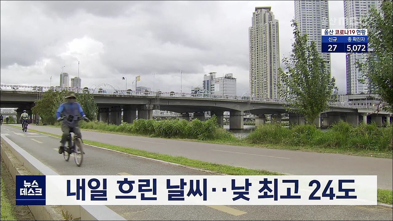 오늘(9/24) 울산지방은 낮 최고 기온이 어제보다 2도 낮은 24.2도를 기록했습니다. 주말인 내일은 오전까지 5mm 안팎의 약한 비가 내리겠으며, 19도~24도의 기온분포가 예상됩니다.울산기상대는 모레까지 해안가를 중심으로 바람이 강하게 불겠다고 예보했습니다.