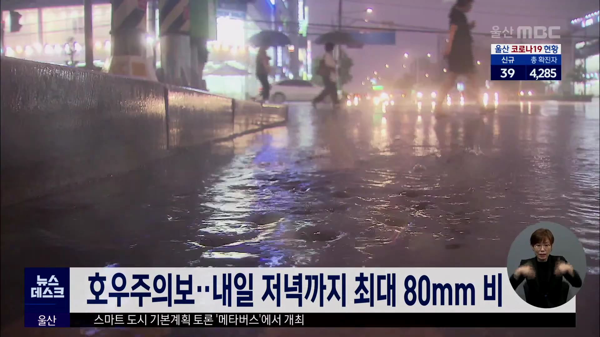 오늘(9/1) 울산지방은 오후 6시 10분을 기해 호우주의보가 발효된 가운데 내일 저녁까지 최대 80mm의 비가 내리겠습니다. 특히 오늘 밤에는 천둥,번개를 동반한 시간당 최대 50mm의 많은 비가 오겠습니다. 울산앞바다에는 현재 풍랑주의보가 내려져 있어 해안가 시설물 관리에 주의가 필요합니다.