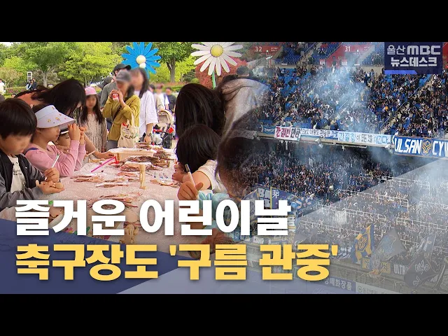 [ 앵 커 ]5월 5일 어린이날을 맞아 울산에서는 어린이들을 위한 다양한 행사가 열렸습니다. 어린이날 울산 문수축구경기장에서 펼쳐진 동해안 더비에는 가족 단위 축구팬이 몰리며 2만 3천명 구름관중이 모였습니다. 정인곤 기자.[ 리포트 ]어린이날 큰잔치가 열린 울산대공원. 엄마 아빠 손을 잡고 나온 아이들로 공원은 ...