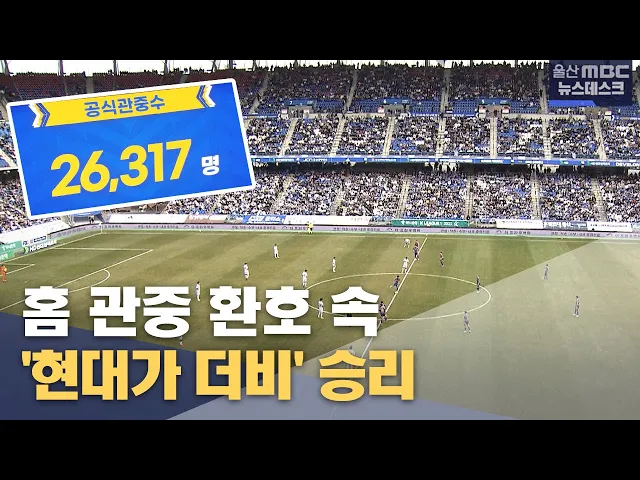 [ 앵 커 ] 리그 4연패에 도전하는 프로축구 울산HD가 현대가 더비에서 전북 현대에 1대 0으로 승리했습니다. 문수축구장을 가득 채운 관중들은 올 시즌 홈경기 첫 승리에 아낌없는 환호를 보냈습니다. 이용주 기자. [ 리포트 ] K리그 홈 개막전에서 FC안양에게 덜미를 잡히고 2라운드 대전에게 첫 승리를 거뒀던 울산HD. 전...