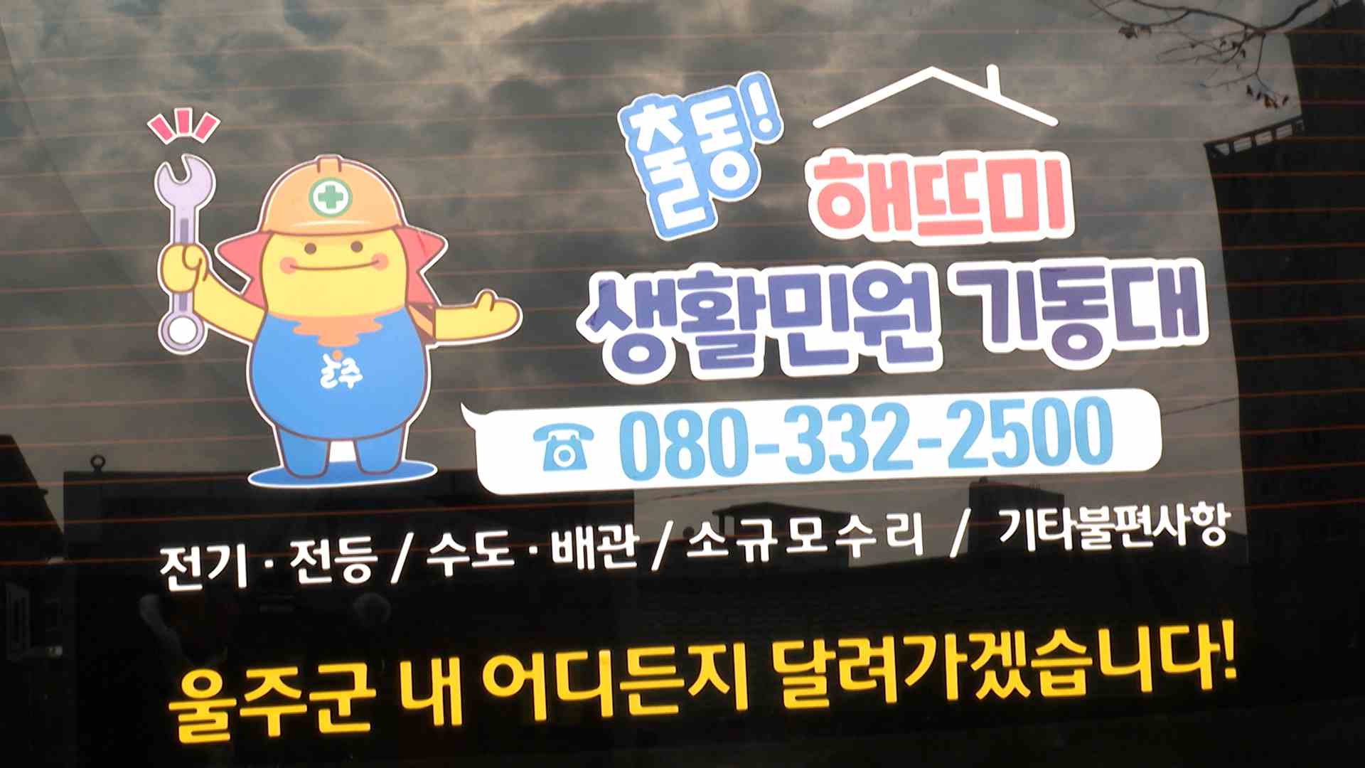 울주군 해뜨미 생활민원기동대가 4년 째 주민불편 2만 여건을 해결한 것으로 나타났습니다. 울주군에 따르면 해뜨미 생활민원기동대가 설립된 2022년 5천여 건을 시작으로 매년 처리건수가 늘어 지난달 말까지 모두 2만 1천여 건을 해결했습니다.내용은 전기 스위치나 수도꼭지 교체가 가장 많았으며, 문고리 수리와 침구 ...