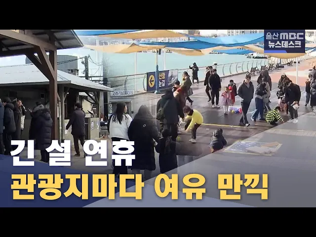[ 앵 커 ] 긴 설 연휴를 맞아 울산지역 관광지에도 여유를 만끽하는 시민들로 북적였습니다. 남은 설 연휴 동안 울산은 맑은 날씨가 이어질 것으로 예상됩니다. 이용주 기자가 연휴 표정을 담아왔습니다. [ 리포트] 삼촌이 알려주는 대로 생애 첫 비석치기를 하고, 엄마를 따라서 어색한 자세로 고무줄 놀이에도 도전해 봅...