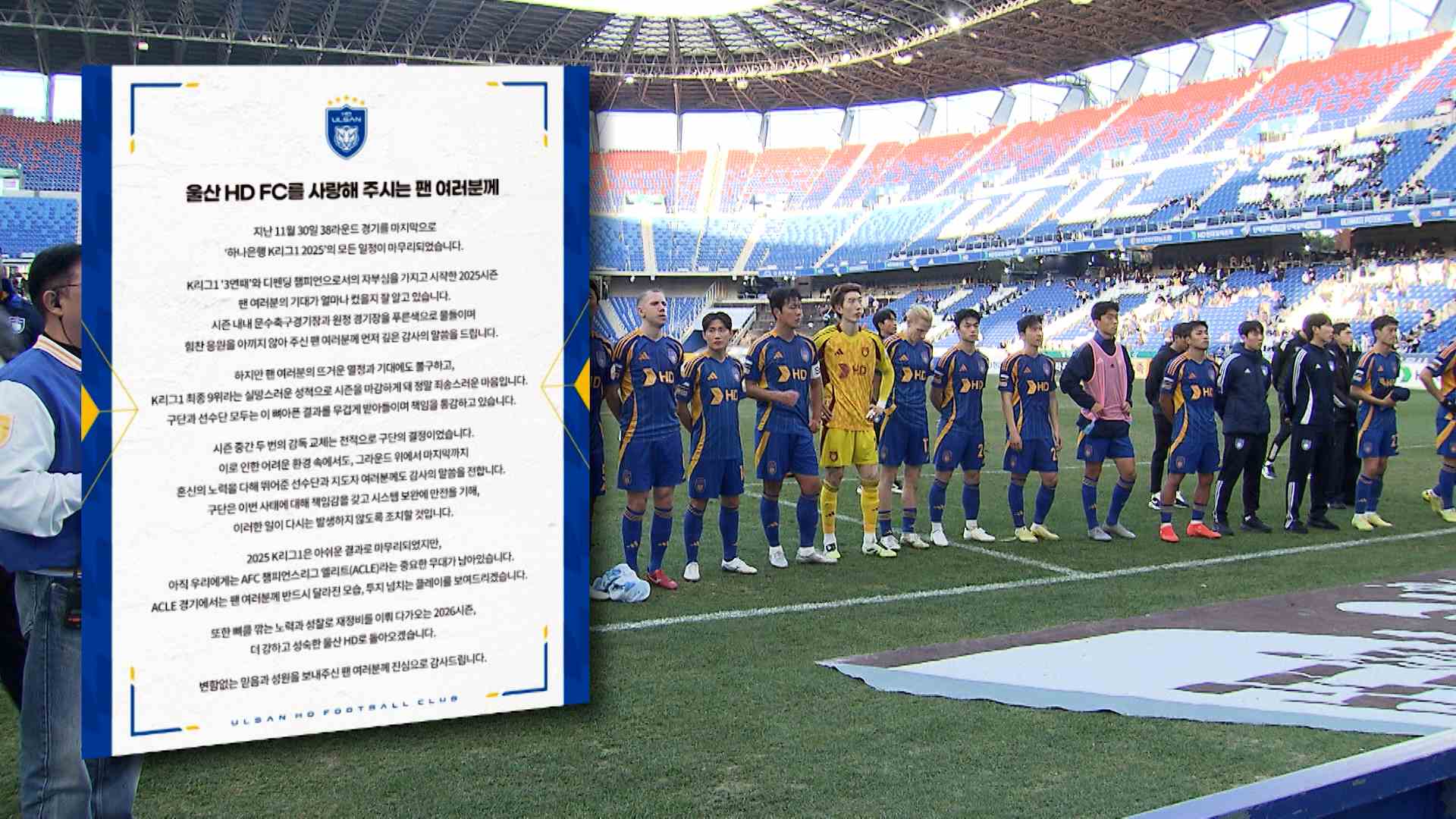프로축구 울산 HD가 오늘(12/2) SNS를 통해 팬들에게 책임을 통감한다며 공식 사과했습니다.울산은 팬들의 기대가 얼마나 컸을지 잘 알고 있다며, 실망스러운 성적으로 시즌을 마쳐 구단과 선수단 모두 책임을 통감하고 있다고 밝혔습니다.또 시즌 중간 두 번의 감독 교체는 전적으로 구단의 결정이었다며 시스템을 보완해 ...