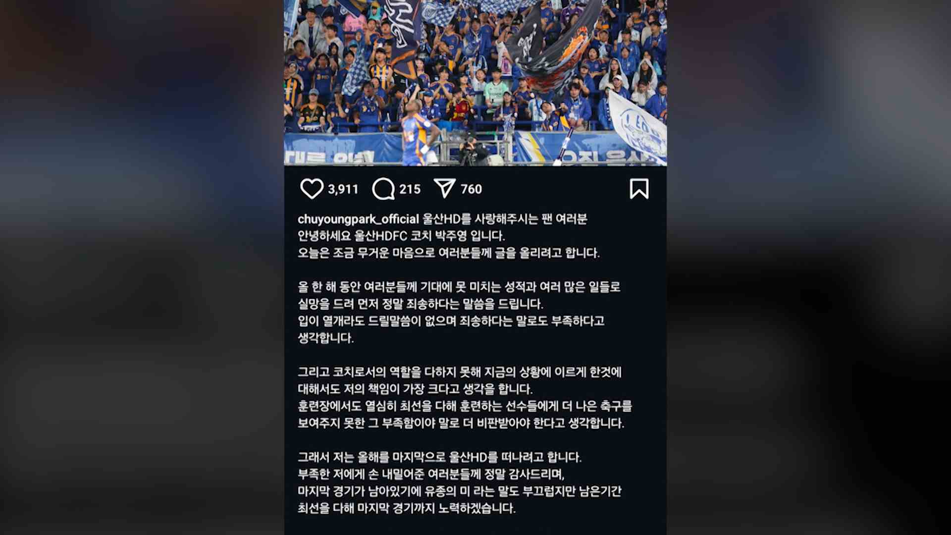 프로축구 울산이 올 시즌 최악의 부진과 내부 갈등을 겪고 있는 가운데 박주영 코치가 개인 SNS를 통해 팀을 떠난다는 뜻을 밝혔습니다.박주영 코치는 부진한 성적과 여러 일들로 실망 드려 죄송하다며, 오는 9일 ACLE 경기를 끝으로 팀을 떠나겠다고 말했습니다.지난 2022년 울산으로 이적해 선수로 활약한 박주영 코치는 ...