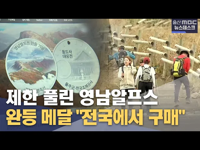◀ 앵 커 ▶ 한국조폐공사가 영남알프스 완등 기념 메달 판매를 시작했습니다. 전국 각지에서 구매에 나서는 등 호응이 큰 것으로 알려졌습니다. 이제 선착순에 들지 못해도 영남알프스 완등자는 누구나 인증 메달을 구입할 수 있어, 더 많은 등반객이 울산을 찾을 것으로 예상됩니다. 유영재 ◀ 리포트 ▶ 영남알프스 완등 인...