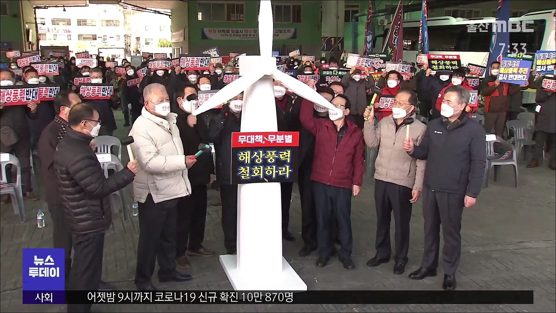 ◀앵커▶ 부산의 어업인들이 해상풍력 발전소 추진을 결사 반대하고 나섰습니다. 가뜩이나 위기에 직면해 있는 지역 수산업이 더욱 위축될 수 있다며, 생존권 문제와 직결된다고 목소리를 높였습니다. 박준오 기자의 보도입니다. ◀리포트▶ [해상풍력 철회하라 철회하라 철회하라] 부산지역 어민들이 부산 공동어시장에서 손 ...