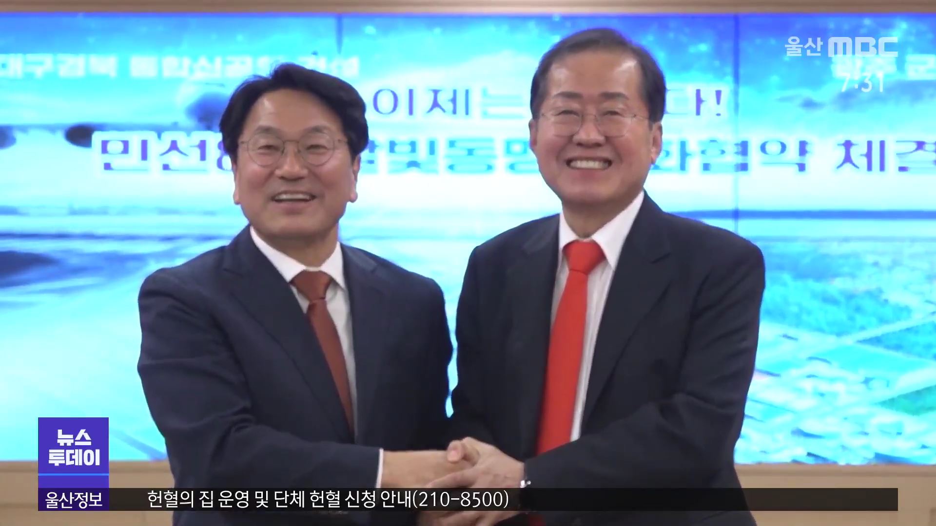[앵커] 대구시가 대구경북 통합신공항 특별법 연내 국회 통과를 성공시키기 위해 달빛동맹 도시인 광주시와 협력을 강화하고 있습니다. 대구와 광주를 잇는 달빛고속철도도 예비타당성 조사 없이 추진할 수 있게 협력하기로 했습니다. 보도에 권윤수 기자입니다. [리포트] 홍준표 대구시장이 취임 후 처음으로 광주로 갔습...