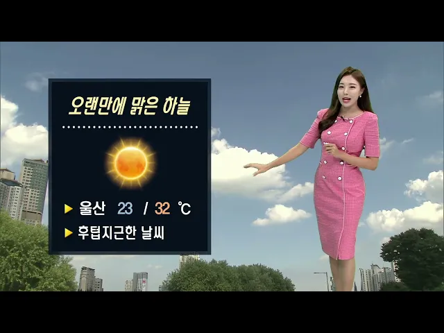 [오늘 맑아요... 낮 최고 32도로 후텁지근]1) 연일 비가 이어진 탓에 오랜만에 맑은 하늘이 반갑기만 합니다. 오늘 오전까지 구름 많다가 오후부터는 하늘 맑아지겠는데요. 낮 동안에는 기온이 32도까지 오르면서 날은 후텁지근하겠습니다.2) 맑은 하늘이 드러나면서 오늘 낮 동안 볕이 강하겠습니다. 울산지역 자외선 지수...
