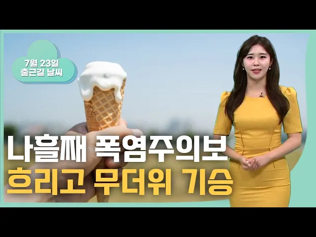 [오전에 비, 오후에 소나기... 폭염특보 강화] 오늘 우산 하나 챙겨 나오셔야겠습니다. 오늘 오전에는 가끔씩 비가, 오후에는 소나기가 내리겠습니다. 특히 소나기는 좁은 지역에 순간적으로 강하게 집중되는 특성이 있기 때문에, 굵은 빗방울이 떨어진다면 빠르게 비를 피해주시는 게 좋겠습니다. 더위의 기세는 갈수록 더...