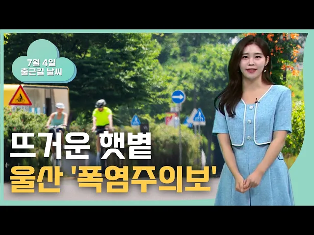 [뜨거운 햇볕 아래 무더위... 울산 '폭염주의보'] 비가 그친 틈을 타 폭염이 찾아왔습니다. 어제부터 울산에 폭염주의보가 내려졌고요. 오늘은 낮 기온 33도까지 오르며 어제보다 더 무덥겠습니다. 영유아나 노약자, 만성질환자는 바깥 활동 시간을 줄여주시는 게 좋겠습니다. 습하고 더운 공기 속에 햇볕도 강하게 내리쬐...