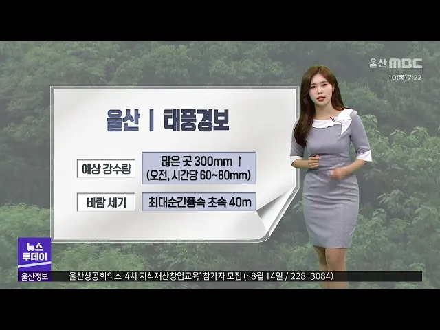 입추에도 폭염 이어져.. 내일부터 태풍 영향 [울산 날씨 (8.8] 절기상 가을에 접어드는 '입추'인 오늘도 폭염의 기세는 여전하겠습니다. 현재 울산에는 폭염주의보가 내려진 가운데 한낮 기온 33도까지 오르겠고요. 현재 기온은 26도를 보이고 있습니다. 오늘 오후부터는 곳곳에 요란한 소나기 소식도 있습니다. 내일부터는...