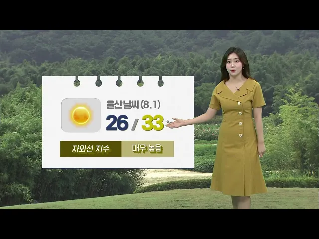 [당분간 무더위 기승..오늘 가끔 비] 오늘은 무더위가 기승을 부리겠습니다. 울산지역의 낮 기온이 31도까지 오르겠고요. 최고 체감 온도는 33도 안팎까지 올라 매우 무덥겠습니다. 한편, 현재 정체전선이 남북을 오르내리면서 강약을 반복하고 있습니다. 따라서 오늘은 가끔 비가 내릴 텐데요. 예상 강수량 분포도를 보시...