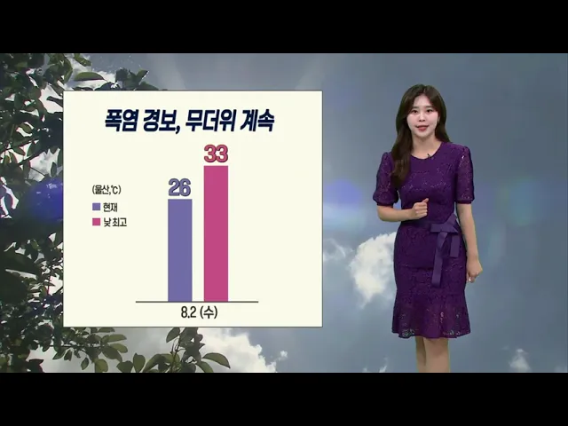 [맑은 날씨, 폭염 위험 수준 '경고'단계] 찌는 듯한 더위에 바깥활동하기가 쉽지 않은 요즘입니다. 울산지역에 폭염경보가 여전히 발효 중인 가운데 오늘 한낮 기온 34도까지 오르겠고요. 현재 기온 26도로 빠른 속도로 기온이 오르고 있습니다. 울산의 폭염 위험 수준도 '경고' 단계를 보이고 있어 대비가 필요한데요. 무...