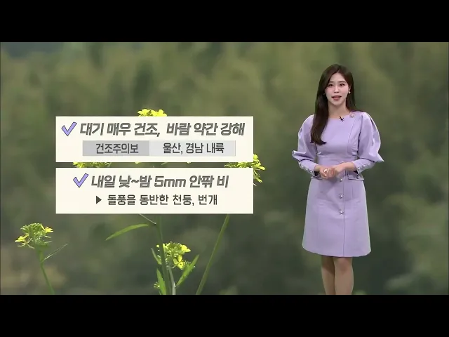 [울산 낮 최고 '21도', 오늘 늦은 오후부터 비] 오늘은 어느 때보다 반가운 단비 소식이 있습니다. 전국을 뒤덮었던 황사가 이 강수로 인해 점차 해소될 텐데요. 오늘 늦은 오후부터 울산에 비가 시작되겠고요. 예상되는 비의 양은 10-40mm 정돕니다. 비가 내리더라도 울산에는 현재 건조경보가 내려진 만큼, 지속적으로 화...