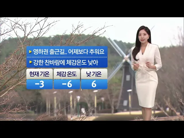 출근길 영하권 추위... 오후에 0.1mm 미만 빗방울 북서쪽 찬 공기의 유입으로 출근길 영하권 추위가 나타나고 있습니다. 오늘은 어제보다 더 춥겠는데요. 현재 아침 기온은 -3도, 찬바람이 강해서 체감온도는 -6도까지 떨어져 있습니다. 낮 최고기온은 6도에 그치며 낮에도 춥겠습니다. 옷차림 든든하게 해주시기 바랍니다....
