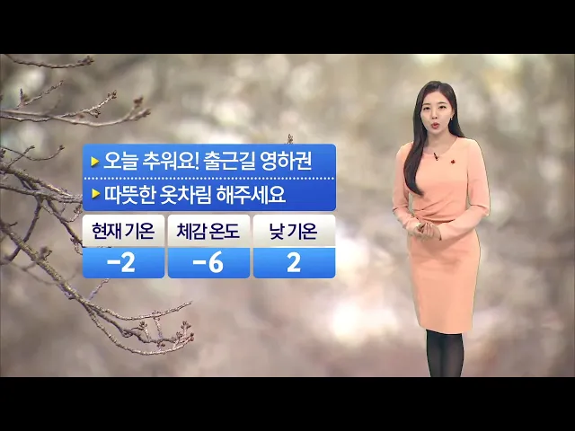 [아침 영하권 추위... 오늘 강풍 조심] 오늘 아침 옷 따뜻하게 입고 나오시기 바랍니다. 출근길 영하권을 기록하고 있는데요. 북서쪽 찬 공기가 내려와 현재 기온은 -2도 보이고 있고, 바람이 강하게 불어 체감온도는 -6도까지 떨어졌습니다. 한낮 기온 크게 오르지 못해 2도에 그치며 매우 춥겠습니다.낮은 기온과 급격한 ...
