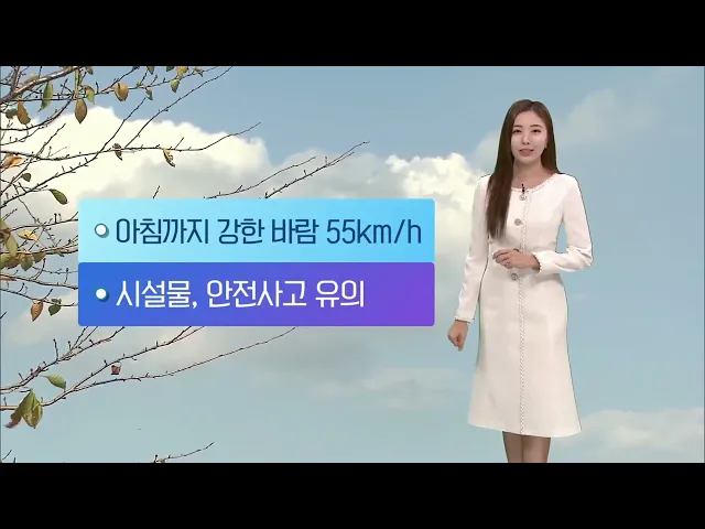 [최저 8도, 아침 기온 뚝... 아침까지 강풍] 오늘 출근길에는 두꺼운 외투를 챙겨 입으시는 게 좋겠습니다. 오늘 아침 기온이 뚝 떨어져 강한 추위가 밀려오고 있는데요. 북서쪽에서 찬 공기가 남하하면서 오늘 아침 최저기온 8도까지 낮아져 올가을 최저기온을 경신했습니다. 기온도 낮은데 아침까지는 강한 바람도 불어오...