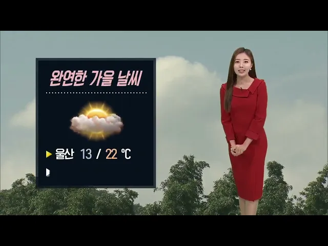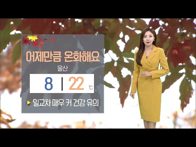 [한낮 22도, 완연한 가을 날씨... 주말 포근해요] 금요일인 오늘도 완연한 가을 날씨가 예상됩니다. 현재 출근길, 울산의 기온 13도로 쌀쌀하게 느껴지는데요. 한낮에는 22도로 예상돼 어제만큼 포근하겠습니다. 다만 일교차가 10도가량 크게 벌어지니까요. 입고 벗기 쉬운 겉옷 챙기셔서 체온 유지 잘 해주시기 바랍니다. ...