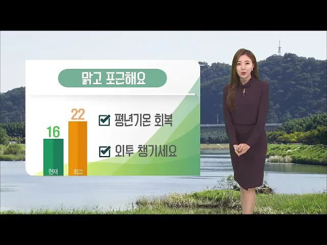 [맑고 포근, 평년기온 회복... 당분간 큰 일교차] 목요일인 오늘 하늘도 맑고 기온도 포근하겠습니다. 아침과 낮 기온 모두 평년기온을 회복했는데요. 아침저녁으로는 쌀쌀하지만 한낮에는 어제처럼 포근하면서 다소 덥게도 느껴질 수 있겠습니다. 입고 벗기 쉬운 외투를 챙기시는 게 좋겠습니다. 당분간 낮 기온은 20도를 ...