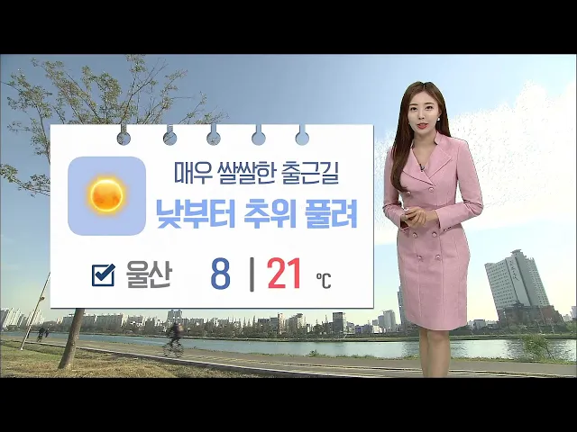 [낮부터 추위 풀려... 큰 일교차 조심] 오늘 아침도 매우 쌀쌀한 출근길이 예상됩니다. 현재 울산의 기온이 8도까지 뚝 떨어져 아침 추위가 이어지고 있는데요. 낮 동안에는 따뜻한 공기와 가을볕이 더해지면서 추위가 풀리겠습니다. 한낮 기온은 21도까지 올라 평년기온을 회복하겠습니다. 아침과 낮 기온이 크게 벌어지면...