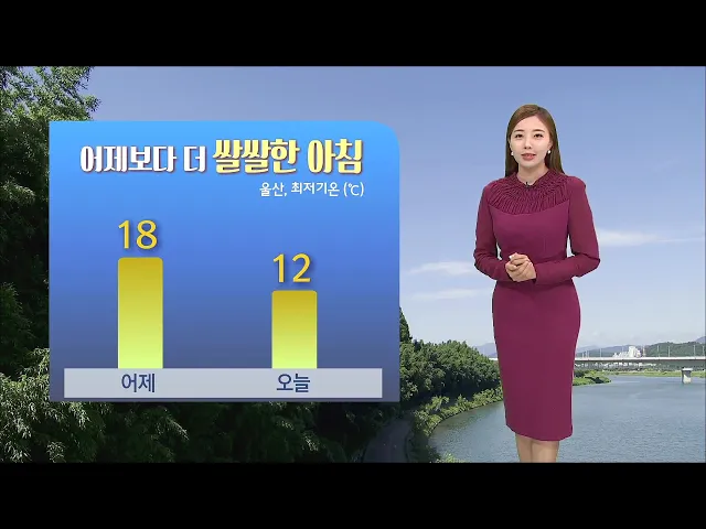 [어제보다 더 '쌀쌀'... 큰 일교차 유의] 오늘 아침 어제보다 더 쌀쌀합니다. 북서쪽에서 찬 공기가 남하하면서 울산의 현재 기온은 12도를 기록하고 있는데요. 어제 아침 같은 시각과 비교했을 때 6도나 낮은 기온입니다. 나오실 때 외투 꼭 챙겨 입으시기 바랍니다. 한낮에는 22도까지 기온이 올라서 선선하겠습니다. 다...